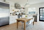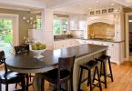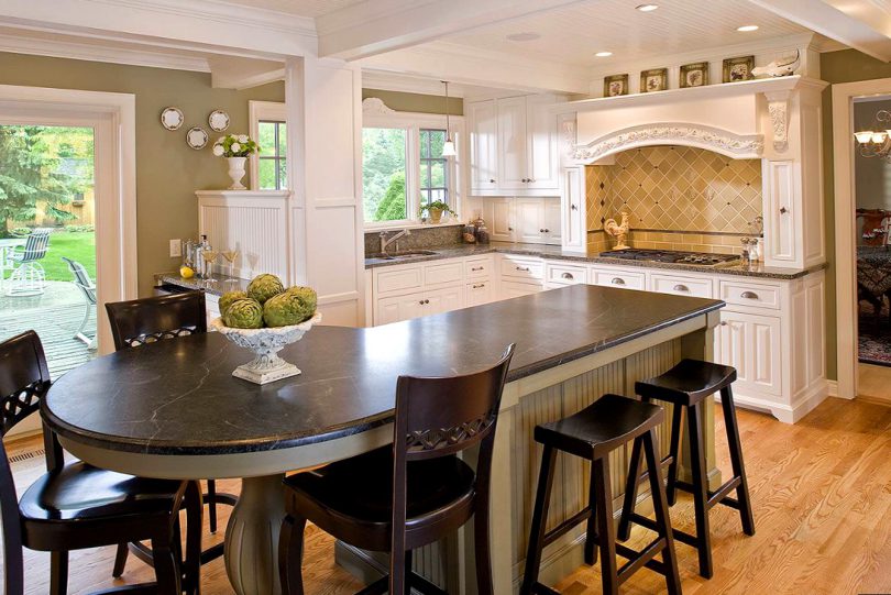 Просторное помещение позволяет поставить массивный кухонный стол любой формы. Большая кухня с прямоугольным или овальным столом в центре зала или возле стены, смотрится величественно и красиво. Небольшой семье с большой кухней будет приятно с утра выпить чай на диванчике, за поставленным перед ним столиком. А вот с маленьким столиком большая кухня будет казаться не просторной столовой, а пустой футбольной площадкой.