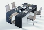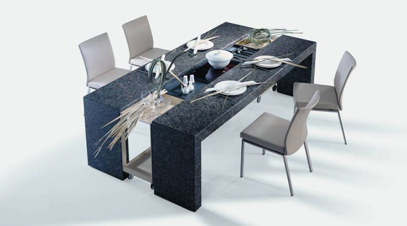 - Столешница из натурального камня придаст комнате особенный изыск. Минус – манерность и вес. Большой кухонный стол из таких материалов будет сложно передвинуть, и на небольшой кухне он будет выглядеть лишним.