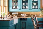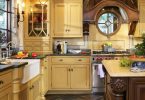 - Комбинирование можно намеренно подчеркнуть. Более яркая и рельефная поверхность будет контрастировать с общим нейтральным или неярким фоном кухни. Центральной частью кухни является зона фартука. Ее можно выделить ярким необычным цветом, рисунком, материалом нестандартной формы и текстуры, а также другой формой укладки. Вставка из стеклянной плитки, имитирующая старинное витражное стекло, будет красиво смотреться над обеденным столом.