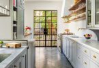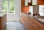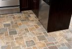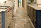 Очень эффектно смотрится каменная кухонная плитка. Ее производят из натурального камня или из смеси песка, мраморной крошки и цемента. Натуральный материал устойчив к влаге, солнечному и искусственному свету. Он может имитировать мрамор, окаменевшее дерево или поверхность древних пещер. Из-за высокой рельефности такую плитку трудно укладывать и очищать. Хотя эту поверхность трудно вымыть, загрязнения на ней практически не видны.