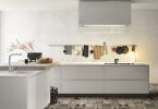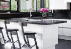 - Каменная плитка великолепно смотрится в виде островков на фоне гладких поверхностей. Если выбран дизайн столешницы под камень, зона фартука с каменным покрытием будет органично ее дополнять.