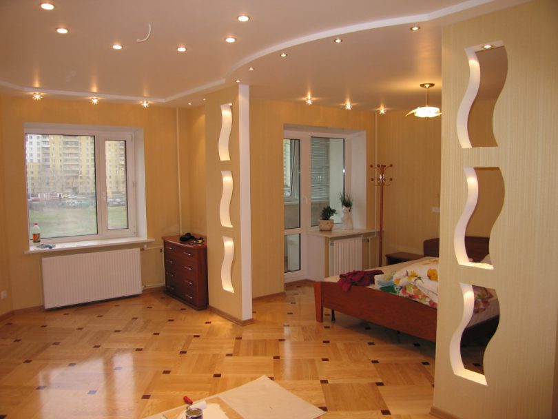 Эффектно выглядит комната, объединенная аркой с лоджией. Дизайнеры делают арки даже в одной комнате, создавая уютные ниши для кровати или рабочего места.