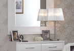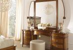 - Если в комнате нет большого зеркала, то на стену, у которой стоит туалетный столик, можно повесить таковое, чтобы была возможность не только наносить макияж и делать причёску, но и подбирать наряд. Хотя некоторым может и не понравиться идея с большим зеркалом в спальне – в таком случае можно установить стол с зеркалом для косметики, которое складывается в столешницу.