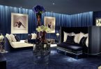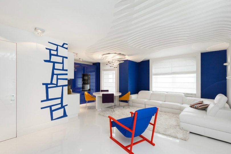- Яркий основной цвет плюс спокойные акценты. Можно поступить наоборот, взяв за основу яркость. Например, глубокий синий окрас ночного неба превосходно смотрится с белым, серебристым. В таком интерьере нелишними будут мерцающие элементы: светильники, люстра, подсветки создадут романтично-сказочное настроение.