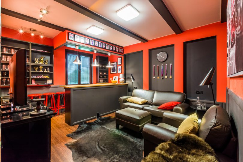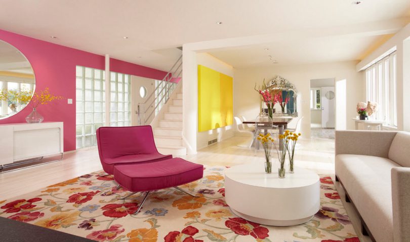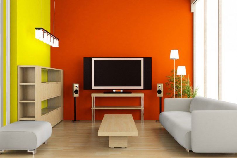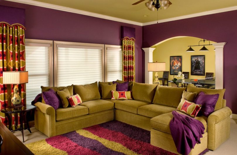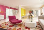 - Комната со стенами ярких цветов, светлым потолком — стильная и броская. Используя яркие оттенки, можно выгодно подчеркнуть достоинства и скрыть недостатки интерьера. В такой комнате рекомендуется поставить светлую мебель, чтобы не перегружать пространство. Яркие аксессуары добавят объем.