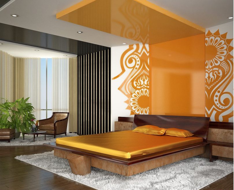 - Спокойные тона плюс яркие акценты. Например, для спальни выбран коралловый оттенок, который составляет 50% всего помещения. Рамы для картин, подушки, коврик можно оформить в оранжевый. Хорошо сюда подойдут белые, черные вкрапления. Вдохновляться можно самой природой, используя для этого закат, глубины океана, ведь в ней всегда все гармонично.