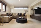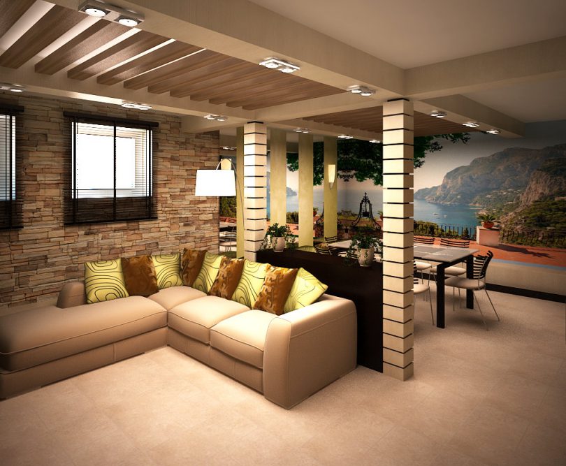 Помещения разной величины требуют индивидуального подхода. Большое пространство обладает рядом преимуществ. Для оформления как нельзя лучше подойдет цветовая палитра из спокойных тонов: шоколадный, травяной, кирпичный, песочный, персиковый, коричневый.