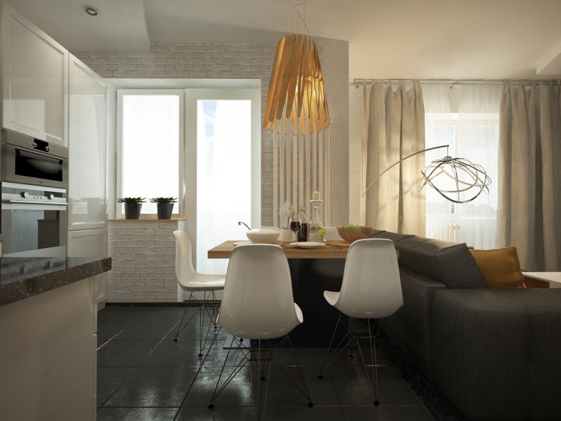 Чаще всего ремонт однокомнатной квартиры предполагает снесение перегородок между основным и дополнительным помещением, например, между гостиной и кухней.
