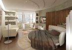 Говоря о спальной зоне, следует понимать, что современный дизайн однокомнатной квартиры предлагает множество вариантов и самые невероятные идеи интерьера. Кровать можно разместить в углублении стены, создав ощущение уединения, а также над рабочим местом. Да-да, появилось немало интересных конструкций, соединяющих в себе письменный стол с кроватью, пристроенной вторым ярусом.