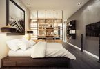 Зонирование не всегда подразумевает собой возведение перегородок. Они могут и вовсе отсутствовать, в свою очередь кровать, как элемент спальни, может гармонично смотреться, объединяясь с гостиной.