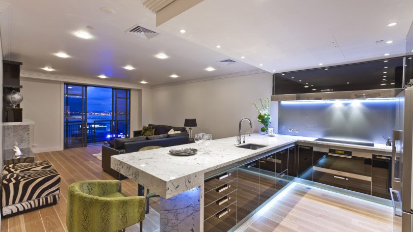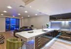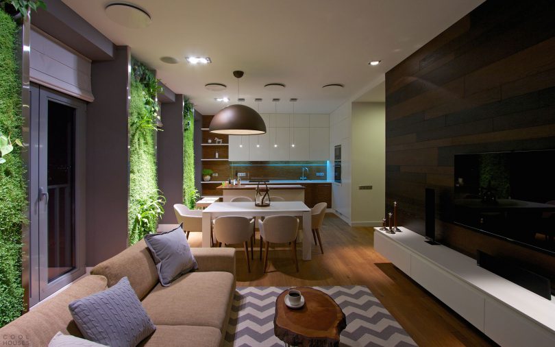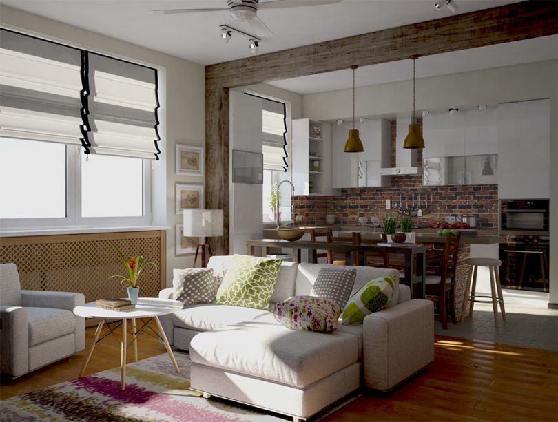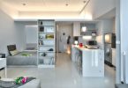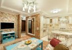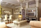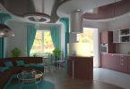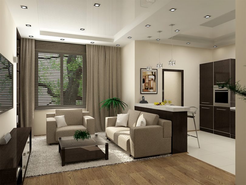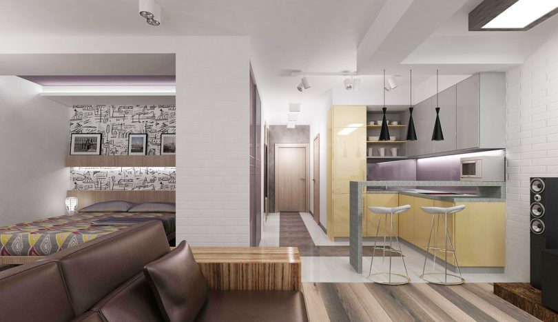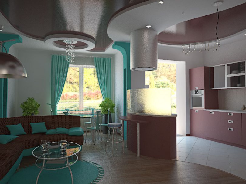 Например, зону кухни можно отделить от зоны спальни разными способами, здесь подойдут стеклянные перегородки или натяжные потолки в разных уровнях. Один из самых популярных способов, это установка барной стойки, которая может превратиться в обеденный стол при необходимости.