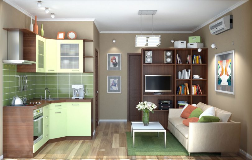 Одним из важных мест в квартире-студии является кухня, но как ни странно, она должна занимать во всем помещении минимум пространства. Для обеспечения потребностей одного человека нужно воспользоваться простыми советами: