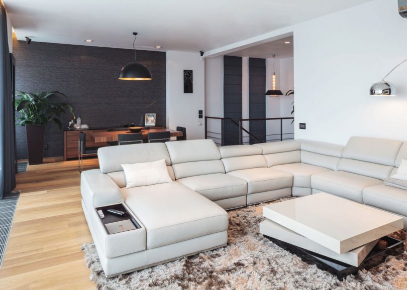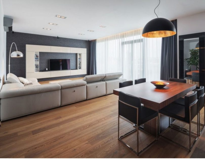 Дизайн интерьера квартиры в современном стиле подразумевает использование спокойных тонов и оттенков. Кроме того, иногда имеет место игра чёрно-белого контраста. Однако на полотне основного цвета вполне можно делать яркие вставки.