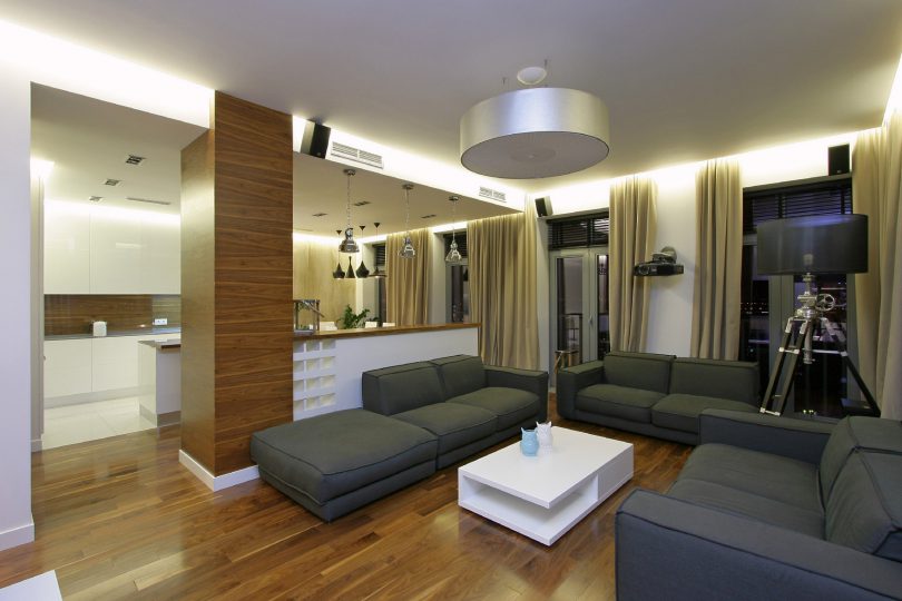 Дизайн квартиры в современном стиле (фото пример которого вы можете посмотреть далее) и требования к нему подразумевают не только эстетичность, но и функциональность получаемого результата. Поэтому сейчас часто практикуется зонирование изначально цельного помещения при помощи одного из нескольких приёмов: