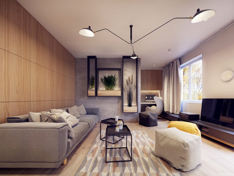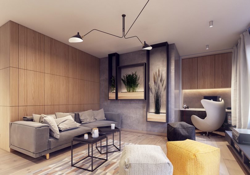 Дизайн интерьера квартиры в современном стиле отличается тем, что в нём широко представлен целый спектр природных материалов: дерево, пробка, бамбук, камень, живые растения. На этом фоне весьма колоритно смотрятся ручные изделия этнического направления. Основное разнообразие материалов появляется не во время отделки, когда только подготавливается база, а в процессе декорирования.