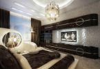 Потолки формируются из гипсокартона или глянца в зависимости от желания владельца и в 99% случаев имеют встроенную подсветку.
