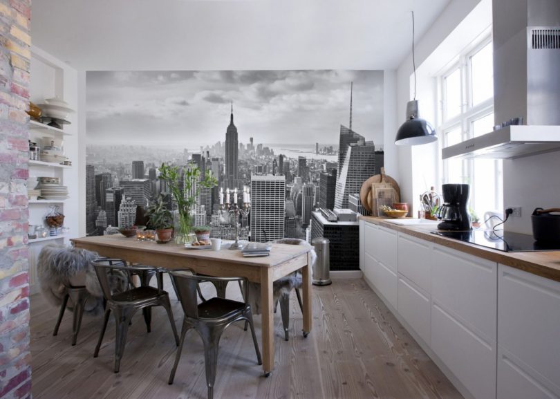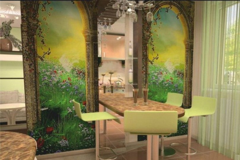 3 d фотообои подойдут для оформления любой комнаты. Даже кухня, имея чаще всего небольшие размеры, нуждается в расширении пространства, которое может обеспечить стереоскопические обои. Обычно ими декорируют стену около обеденного стола. Они разбавляют бытовую атмосферу кухни и создают некий эстетический эффект. Создается чувственная атмосфера отдыха, расслабленности и фантазии, например, стереоскопические обои в интерьере на фото ниже.