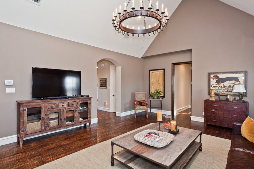 Контрастный по отношению к хай-тек стиль кантри и смежные с ним средиземноморский и другие «сельские» дизайны основаны на использовании природного дерева для изготовления мебели, в том числе и подставки под ТВ.