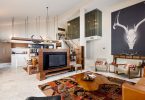 Для этого дизайна характерно размещение предметов в углах. Поэтому угловая тумба под телевизор, сбитая из толстых некрашеных досок, хорошо смотрится как в спальне, так и в гостиной, столовой или на кухне.