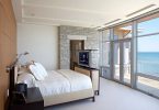 Очень интересным является сочетание такой подставки со встроенным в нее камином. Топка и дымоход вписаны в общий интерьер так, что они не видны снаружи, их закрывают декоративные панели. Зрителям виден только прозрачный экран из жаропрочного стекла, за которым резвятся языки пламени.