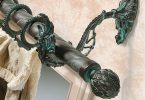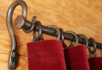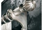 Как правило, гардины в таком стиле выглядят массивно и шьются из плотных и тяжёлых материалов. В дополнение к ним может идти тюль из прозрачного материала. В данном лучше всего случае подобрать металлическую консоль-штангу с элементами ковки и несколькими рядами – она гораздо прочнее других вариантов и будет хорошо сочетаться с массивными портьерами. Вариант крепления лучше выбирать настенный либо потолочный – главное, чтобы было надежное крепление. Занавеси с люверсами также лучше вешать на металлические конструкции. Если позволяет пространство, сам карниз можно оформить немного другим способом – обычную штангу скрыть за декоративной панелью.