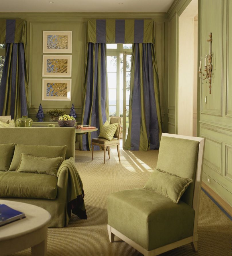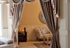 - В стиле ампир присутствуют темные тона красного, синего и фиолетового. Часто украшаются массивной бахромой и узорами бронзового цвета. Данный вид изготавливается из достаточно тяжелых тканей, поэтому больше подходит для гостиных комнат.