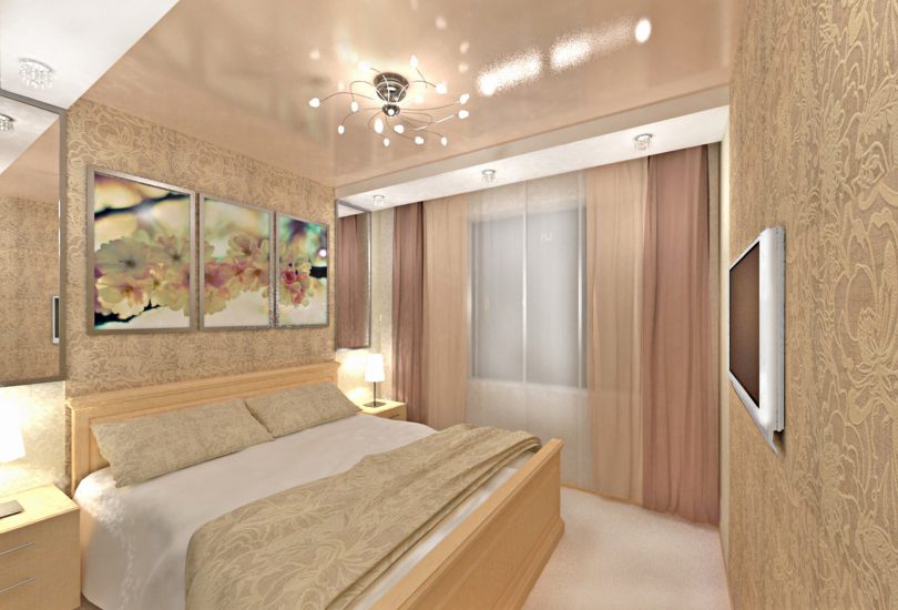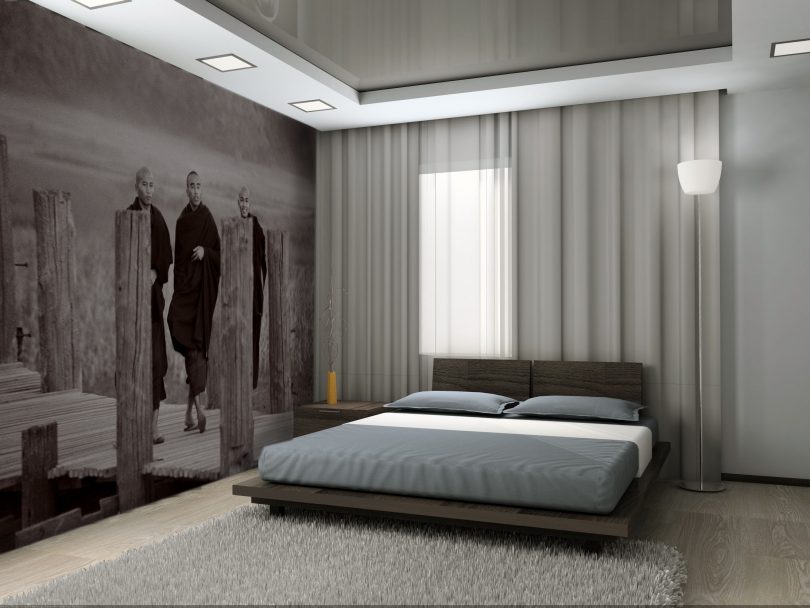 Потолочное полотно в спальне можно украсить при помощи фотопечати. Эта технология позволяет не только нанести на полотно изящный орнамент, но и превратить поверхность в целую картину, правильно подобранная композиция на которой может создать зрительный эффект расширения пространства комнаты.