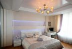 Помимо традиционной установки центрального источника света, например люстры, могут быть применены более оригинальные решения. Так, освещение в спальне с натяжными потолками может быть выполнено по периметру комнаты.