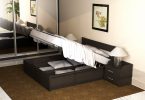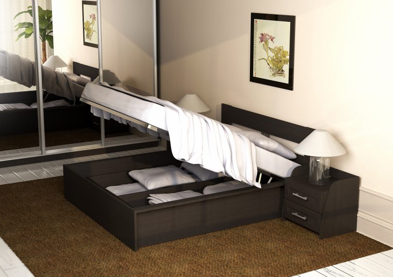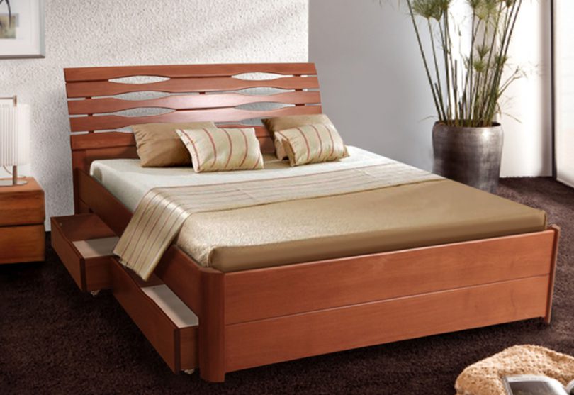 Выбирая двуспальную кровать для небольшой комнаты, стоит обратить внимание на модели с выдвижными ящиками и подъемным механизмом. Это поможет хоть немного решить вопрос свободного пространства.