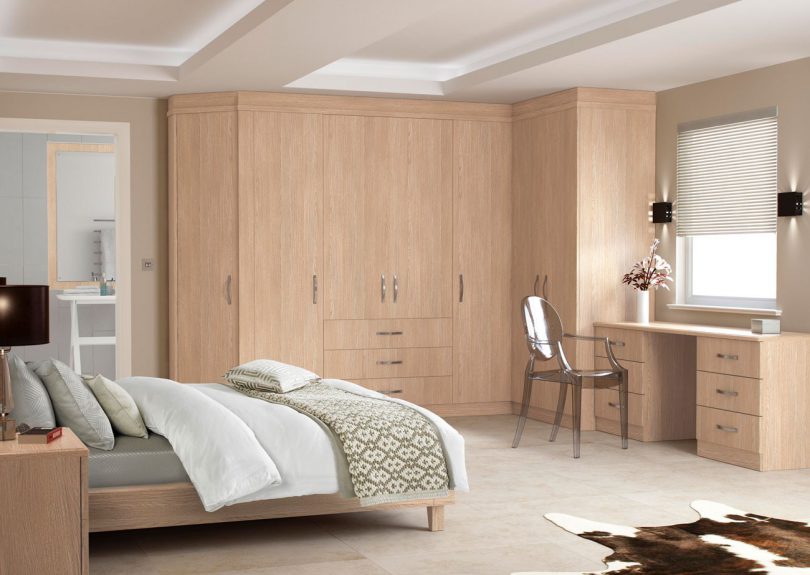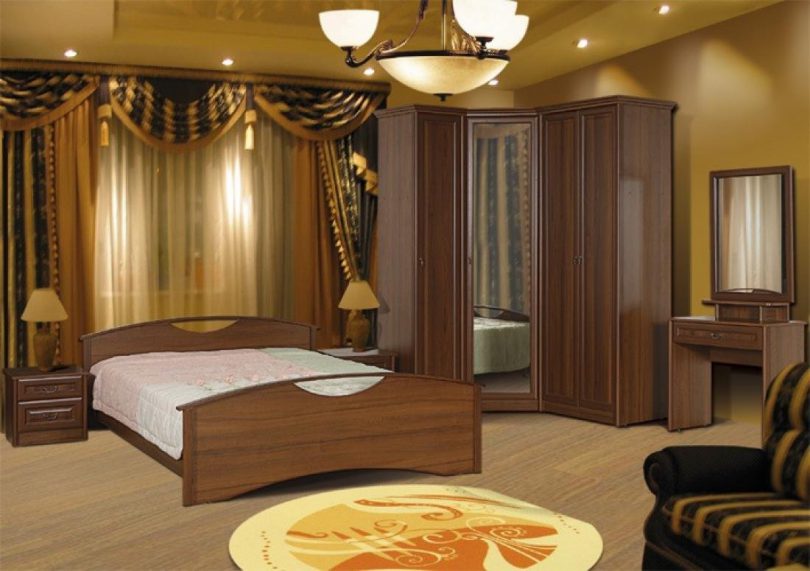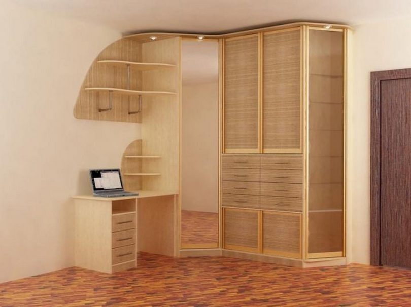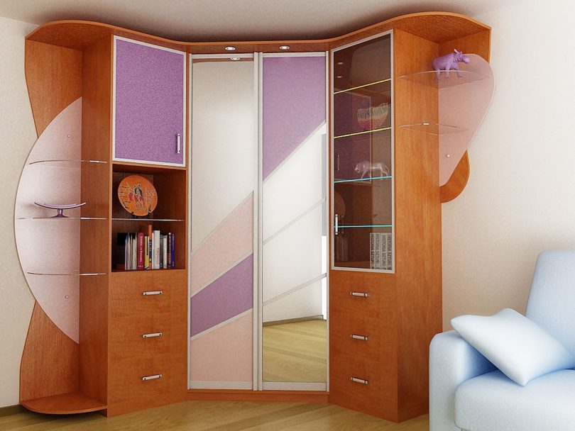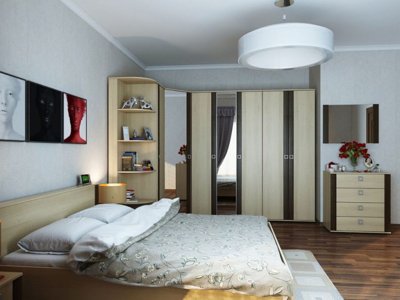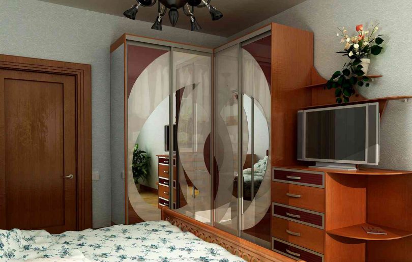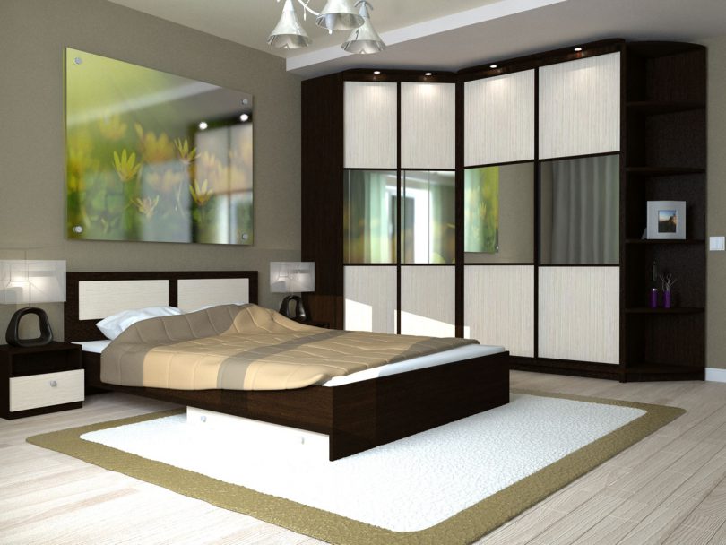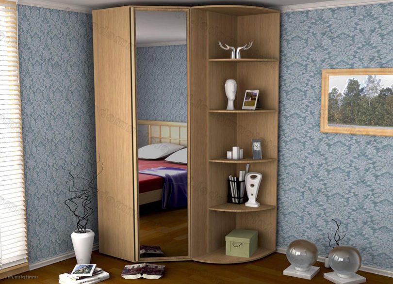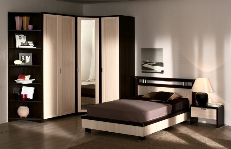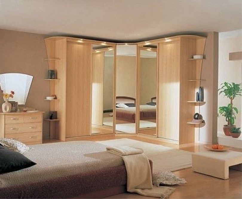 Чтобы не отказываться от нужных предметов обстановки, в качестве отличного решения задачи были разработаны угловые шкафы для спальни. Преимущество такой постановки вопроса в следующем: