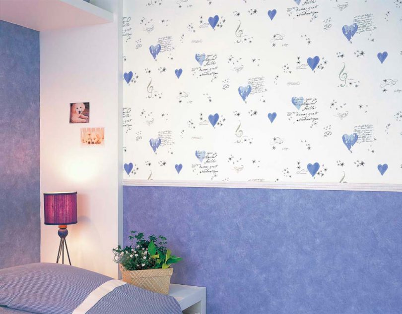 В нижней части стены может размещаться богатый орнамент. Тогда верхний участок оклеивают светлыми гладкими однотонными обоями.