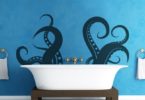На фотографиях санузла с современным дизайном зачастую можно видеть оригинальные принты с изображением надписей, силуэтов, орнаментов. Как выполнить такую роспись без специальных художественных навыков? Ответ прост — для этого нужно использовать обычные трафареты. Они изготавливаются из прочной бумаги и фиксируются на поверхности при помощи малярной ленты, а затем заполняются краской, используя специальную трафаретную кисть или обычную бытовую губку.